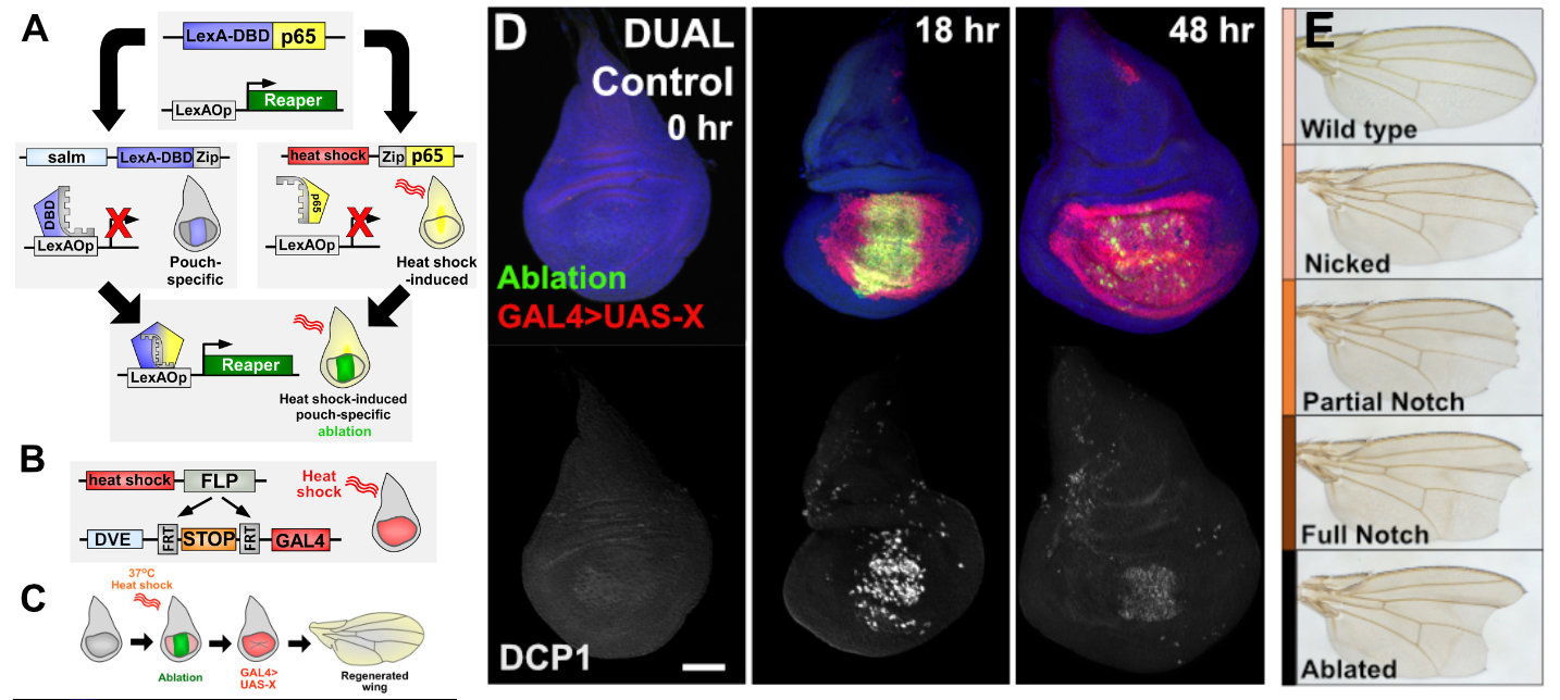 To allow gene manipulation to be independent of ablation, we generated a system based on a split version of LexA, in which ablation is achieved using two transgenes that encode separate halves of a transcriptional activator (LexA:DBD and p65). Each half contributes either spatial or temporal control over expression: a tissue-specific spalt (salm) enhancer drives one half in the distal wing pouch, while a heat shock promoter directs expression of a p65 transcriptional activator domain. A short heat shock triggers p65 expression, leading to the temporary formation of the full transcriptional activator only in the distal pouch. This transcriptional activator then drives expression of any lexAop-transgene, including those we have developed to cause cell death via apoptosis (via JNK signaling or independent of JNK) and necrosis (via different leaky or activated ion channels).